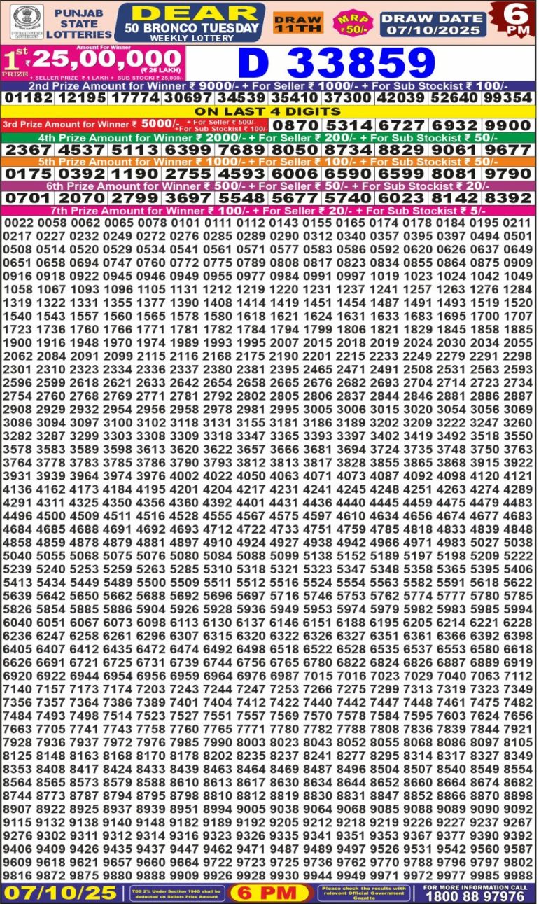 Dear 50 bronco Tuesday weekly lottery 6pm 07/10/2025 October 7, 2025 Leave a Comment on Dear 50 bronco Tuesday weekly lottery 6pm 07/10/2025 Posted in Results Share now: XFacebookPinterestRedditVKDiggLinkedinMix Related Results 0 22 Dear lucky Saturday weekly lottery 8pm 08/11/2025 0 21 Dear 2000 monthly lottery 7pm 08/11/2025 0 22 Dear 50 jackal Saturday weekly lottery 6pm 08/11/2025 0 17 Dear elite Saturday weekly lottery 6pm 08/11/2025