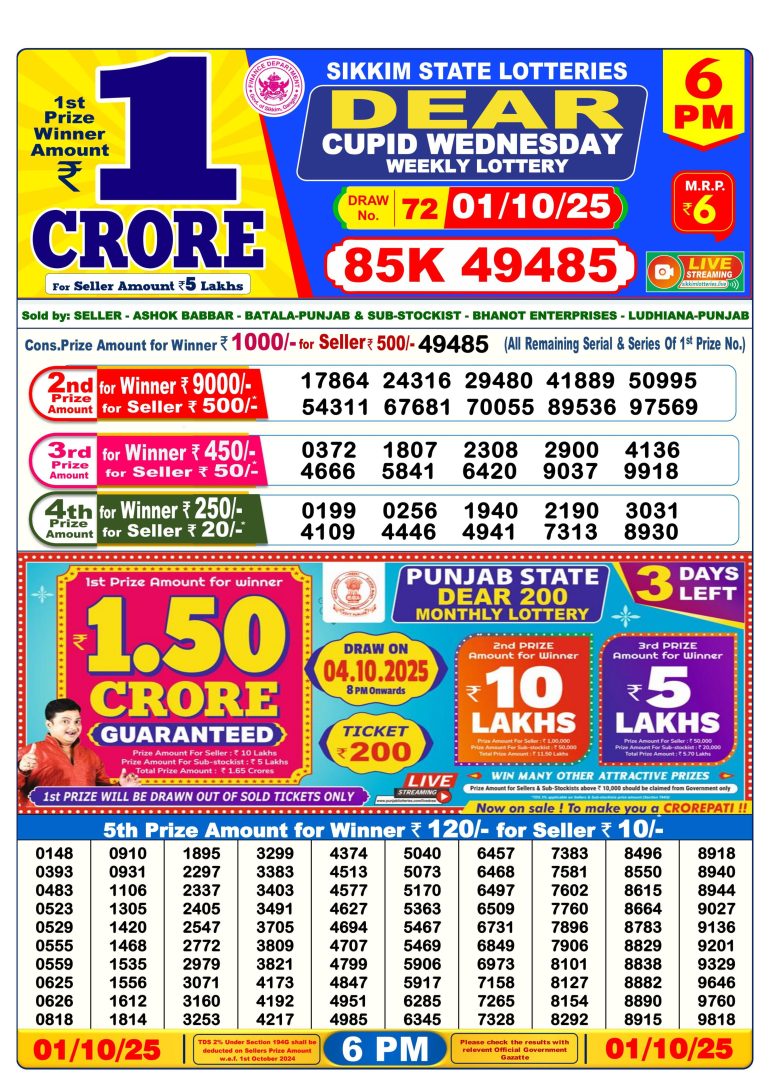 Dear cupid Wednesday weekly lottery 6pm 01/10/2025 October 1, 2025 Leave a Comment on Dear cupid Wednesday weekly lottery 6pm 01/10/2025 Posted in Results Share now: XFacebookPinterestRedditVKDiggLinkedinMix Related Results 0 23 Dear lucky Saturday weekly lottery 8pm 08/11/2025 0 21 Dear 2000 monthly lottery 7pm 08/11/2025 0 22 Dear 50 jackal Saturday weekly lottery 6pm 08/11/2025 0 17 Dear elite Saturday weekly lottery 6pm 08/11/2025