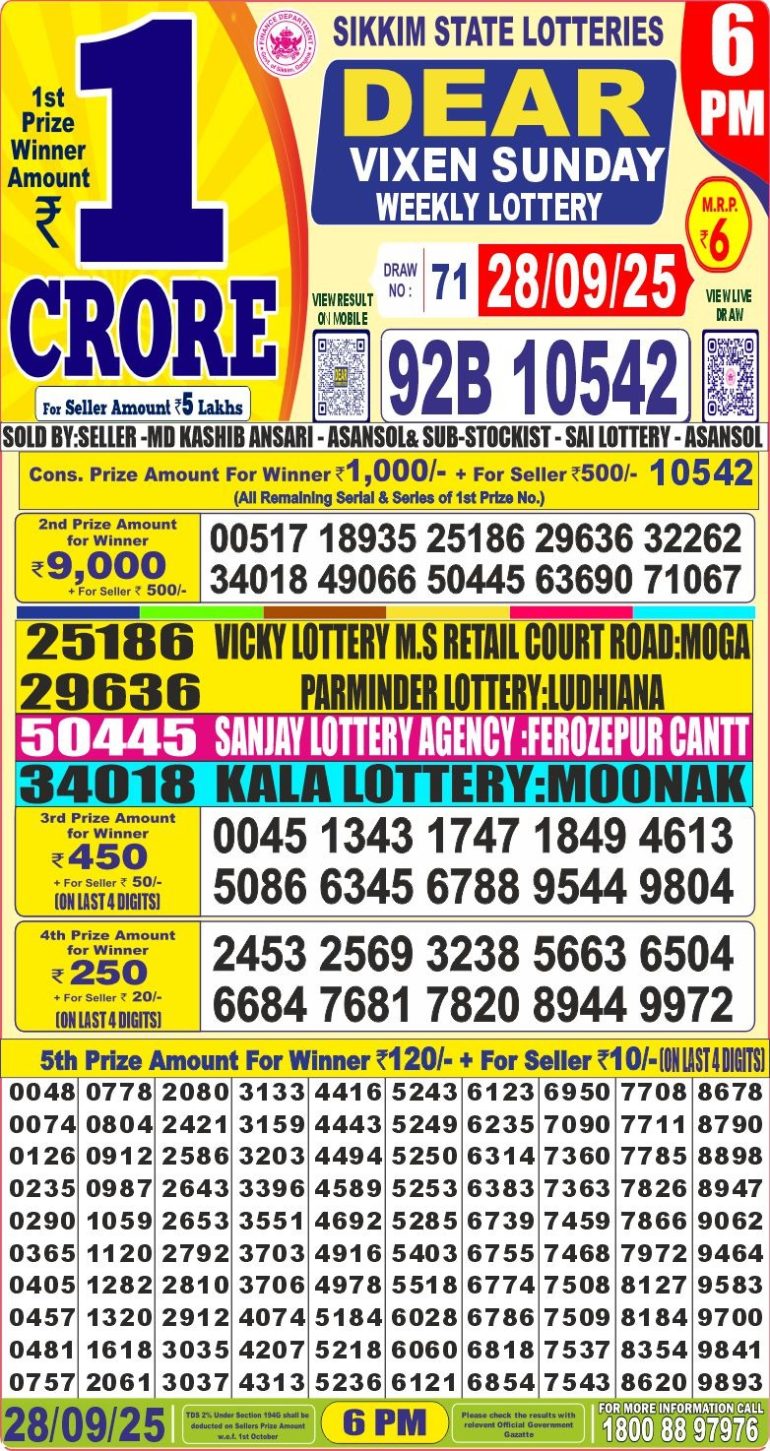 Dear vixen sunday weekly lottery 6pm 28/09/2025