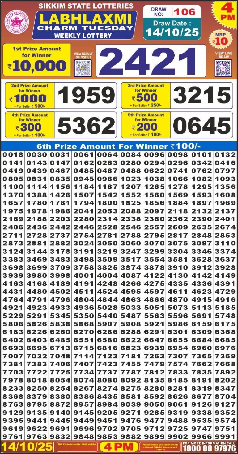 Labhlaxmi charm Tuesday weekly lottery 4pm 14/10/2025 October 14, 2025 Leave a Comment on Labhlaxmi charm Tuesday weekly lottery 4pm 14/10/2025 Posted in Results Share now: XFacebookPinterestRedditVKDiggLinkedinMix Related Results 0 20 Dear lucky Saturday weekly lottery 8pm 08/11/2025 0 19 Dear 2000 monthly lottery 7pm 08/11/2025 0 22 Dear 50 jackal Saturday weekly lottery 6pm 08/11/2025 0 15 Dear elite Saturday weekly lottery 6pm 08/11/2025