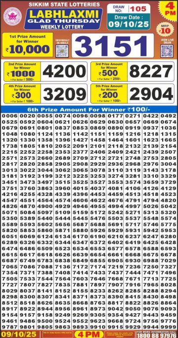 Labhlaxmi glad Thursday weekly lottery 4pm 09/10/2025