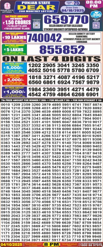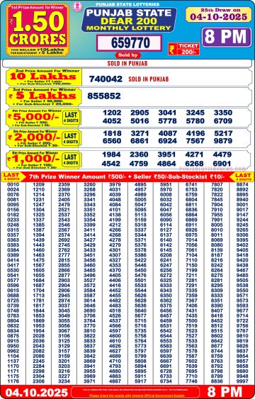 Punjab state dear 200 monthly lottery result 8pm 04/10/2025
