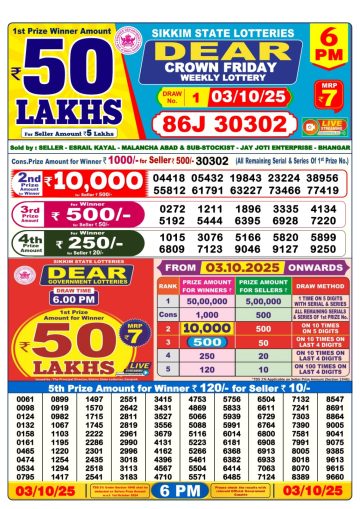 Dear 50 colt Friday weekly lottery 03/10/2025