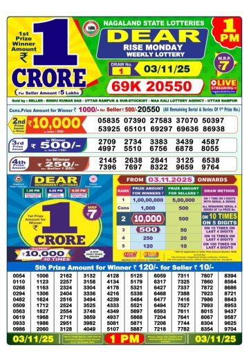 Dear rise Monday weekly lottery 1pm 03/11/2025