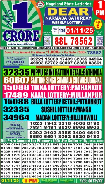 Dear Narmada Saturday weekly lottery 1pm 01/11/2025