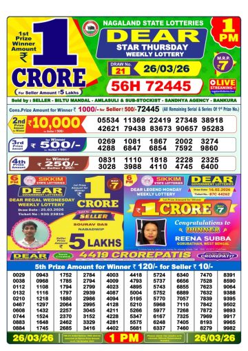 Dear Star Thursday weekly lottery 1pm 26/03/2026