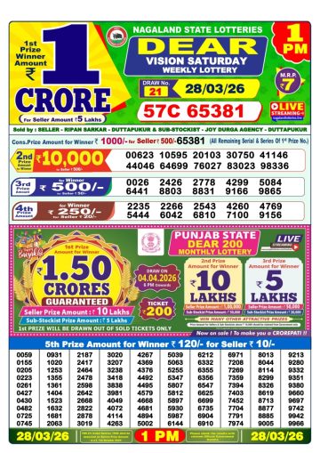 Dear vision Saturday weekly lottery 1pm 28/03/2026