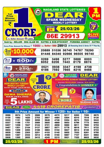 Dear shine Tuesday weekly lottery 1pm 24/03/2026