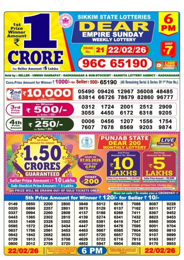 Dear empire sunday weekly lottery 6pm 22/02/2026