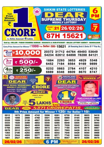 Dear supreme Thursday weekly lottery 6pm 26/02/2026