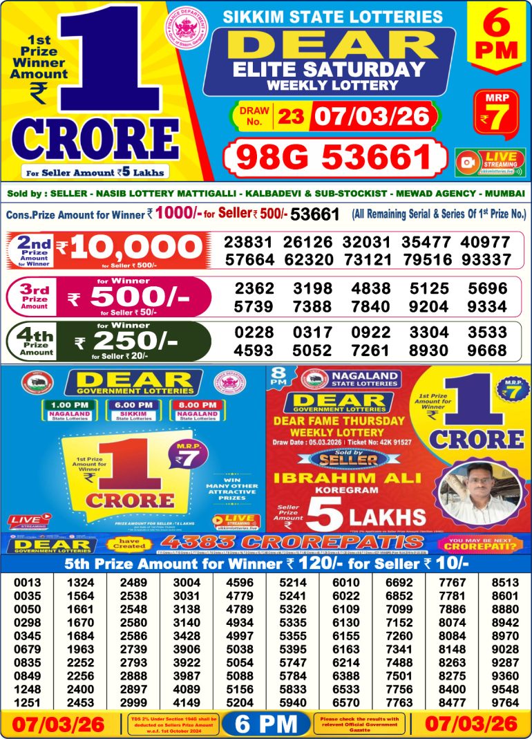 Dear elight Saturday weekly lottery 6pm 07/03/2026 March 7, 2026 Leave a Comment on Dear elight Saturday weekly lottery 6pm 07/03/2026 Posted in Dear 6PM Result Share now: XFacebookPinterestRedditVKDiggLinkedinMix Related Results 0 2 Dear elight Saturday weekly lottery 6pm 03/04/2026 0 3 Dear regal Wednesday weekly lottery 6pm 01/04/2026 0 3 Dear prestige tuesday weekly lottery 6pm 31/03/2026 0 3 Dear legend Monday weekly lottery 6pm 30/03/2026