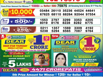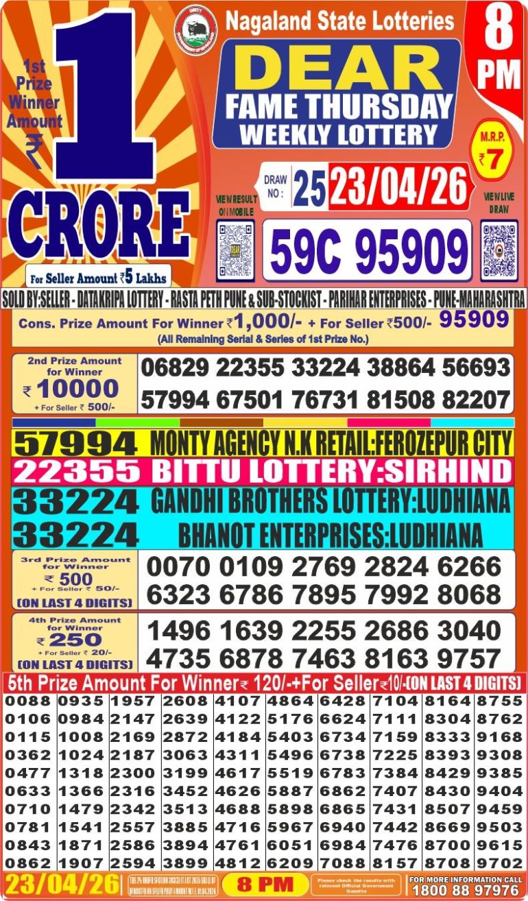 DEAR FAME THURSDAY WEEKLY LOTTERY 8PM 23/04/2026 April 23, 2026 Leave a Comment on DEAR FAME THURSDAY WEEKLY LOTTERY 8PM 23/04/2026 Posted in Results Share now: XFacebookPinterestRedditVKDiggLinkedinMix Related Results 0 1 DEAR VICTORY FRIDAY WEEKLY LOTTERY 1PM 24/04/2026 0 2 DEAR SUPREME THURSDAY WEEKLY LOTTERY 6PM 23/04/2026 0 2 DEAR 50 CHIEF THURSDAY WEEKLY LOTTERY 5PM 23/04/2026 0 3 LABH LAXMI GLAD THURSDAY WEEKLY LOTTERY 4PM 23/04/2026