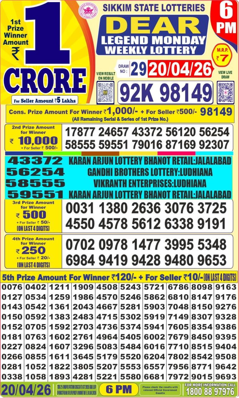 DEAR LEGEND MONDAY WEEKLY LOTTERY 6PM 20/04/2026 April 20, 2026 Leave a Comment on DEAR LEGEND MONDAY WEEKLY LOTTERY 6PM 20/04/2026 Posted in Results Share now: XFacebookPinterestRedditVKDiggLinkedinMix Related Results 0 1 DEAR SHINE TUESDAY WEEKLY LOTTERY 1PM 21/04/2026 0 1 DEAR CLOVER MONDAY WEEKLY LOTTERY 8PM 20/04/2026 0 1 DEAR 50 BEAST MONDAY WEEKLY LOTTERY 5PM 20/04/2026 0 2 LABH LAXMI BLISS MONDAY WEEKLY LOTTERY 4PM 20/04/2026