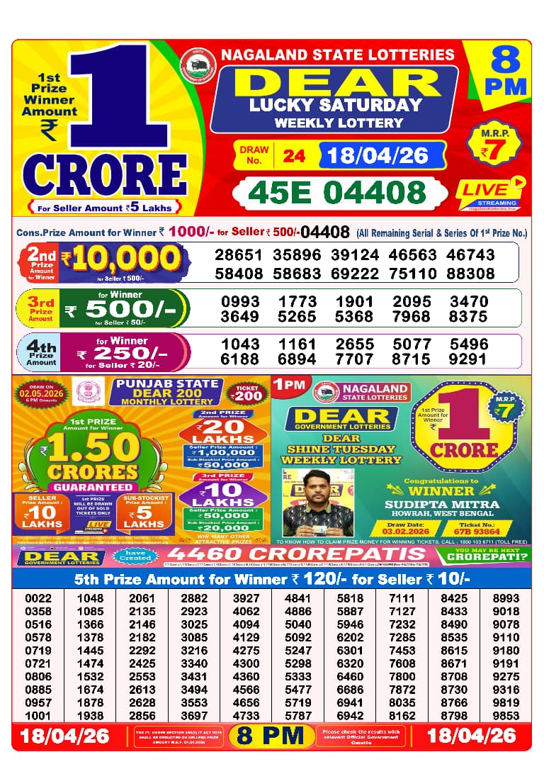 DEAR LUCKY SATURDAY WEEKLY LOTTERY 8PM 18/04/2026 April 19, 2026 Leave a Comment on DEAR LUCKY SATURDAY WEEKLY LOTTERY 8PM 18/04/2026 Posted in Results Share now: XFacebookPinterestRedditVKDiggLinkedinMix Related Results 0 1 PUNJAB STATE DEAR BAISAKHI BUMPER RESULT 18/04/2026 0 0 DEAR ELITE SATURDAY WEEKLY LOTTERY 6PM 18/04/2026 0 2 DEAR 50 JACKAL SATURDAY WEEKLY LOTTERY 5PM 18/04/2026 0 2 LABH LAXMI JOY SATURDAY WEEKLY LOTTERY 4PM 18/04/2026