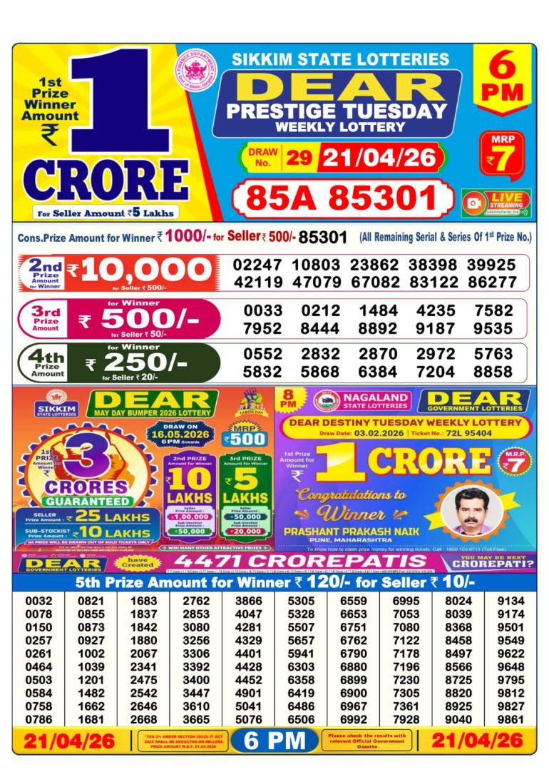 DEAR PRESTIGE TUESDAY WEEKLY LOTTERY 6PM 21/04/2026 April 21, 2026 Leave a Comment on DEAR PRESTIGE TUESDAY WEEKLY LOTTERY 6PM 21/04/2026 Posted in Results Share now: XFacebookPinterestRedditVKDiggLinkedinMix Related Results 0 1 DEAR 50 BRONCO TUESDAY WEEKLY LOTTERY 5PM 21/04/2026 0 1 LABH LAXMI CHARM TUESDAY WEEKLY LOTTERY 4PM 21/04/2026 0 1 DEAR SHINE TUESDAY WEEKLY LOTTERY 1PM 21/04/2026 0 2 DEAR CLOVER MONDAY WEEKLY LOTTERY 8PM 20/04/2026
