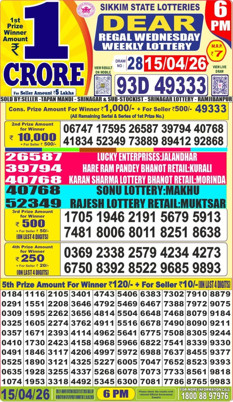DEAR REGAL WEDNESDAY WEEKLY LOTTERY 6PM 15/04/2026 April 15, 2026 Leave a Comment on DEAR REGAL WEDNESDAY WEEKLY LOTTERY 6PM 15/04/2026 Posted in Dear 6PM Result Share now: XFacebookPinterestRedditVKDiggLinkedinMix Related Results 0 1 DEAR Supreme Thursday WEEKLY LOTTERY 6PM 16/04/2026 0 9 Dear elite Saturday weekly lottery 6pm 11/04/2026 0 7 Dear crown Friday weekly lottery 6pm 10/04/2026 0 7 Dear supreme Thursday weekly lottery 6pm 09/04/2026