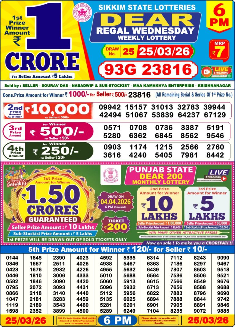 Dear regal Wednesday weekly lottery 6pm 25/03/2026 March 25, 2026 Leave a Comment on Dear regal Wednesday weekly lottery 6pm 25/03/2026 Posted in Dear 6PM Result Share now: XFacebookPinterestRedditVKDiggLinkedinMix Related Results 0 1 Dear legend Saturday weekly lottery 6pm 04/04/2026 0 1 Punjab State 200 Monthly Result 6pm 04/04/2026 0 3 Dear elight Saturday weekly lottery 6pm 03/04/2026 0 4 Dear regal Wednesday weekly lottery 6pm 01/04/2026