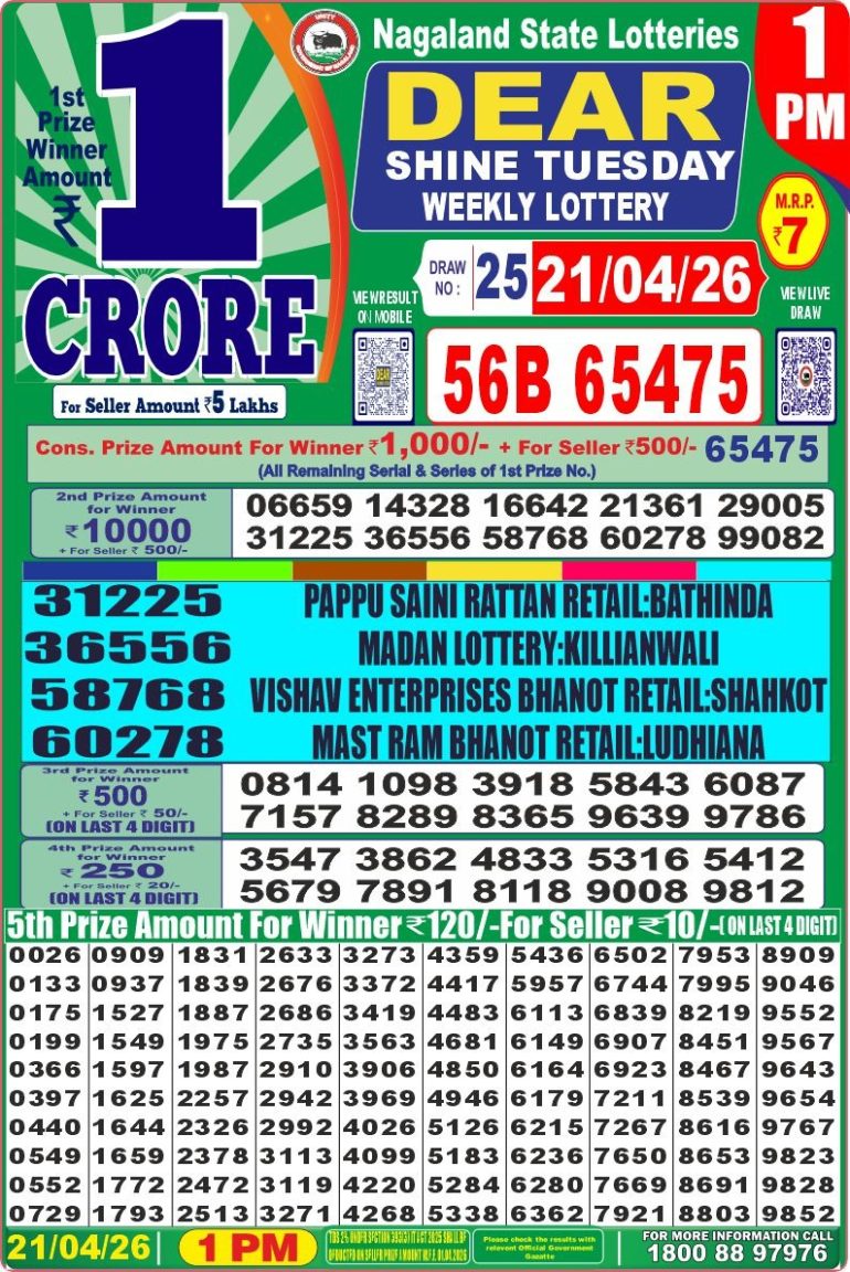 DEAR SHINE TUESDAY WEEKLY LOTTERY 1PM 21/04/2026 April 21, 2026 Leave a Comment on DEAR SHINE TUESDAY WEEKLY LOTTERY 1PM 21/04/2026 Posted in Results Share now: XFacebookPinterestRedditVKDiggLinkedinMix Related Results 0 1 DEAR CLOVER MONDAY WEEKLY LOTTERY 8PM 20/04/2026 0 1 DEAR 50 BEAST MONDAY WEEKLY LOTTERY 5PM 20/04/2026 0 1 DEAR LEGEND MONDAY WEEKLY LOTTERY 6PM 20/04/2026 0 2 LABH LAXMI BLISS MONDAY WEEKLY LOTTERY 4PM 20/04/2026