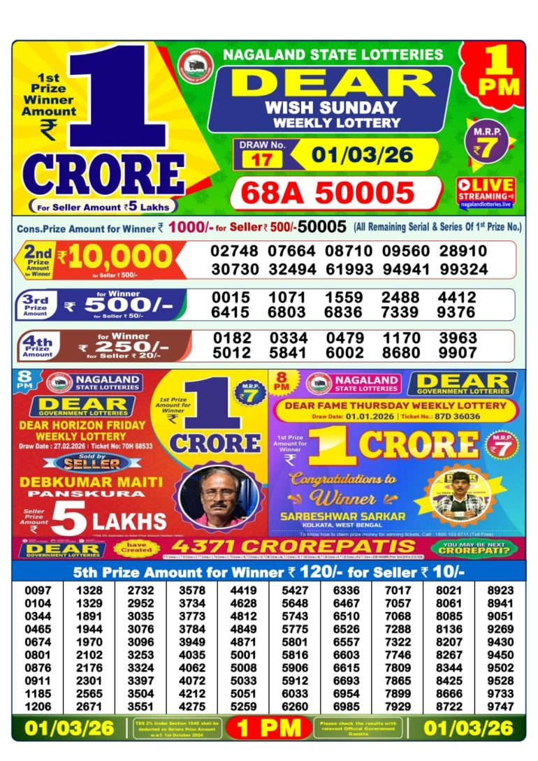 Dear wish sunday weekly lottery 1pm 01/03/2026 March 1, 2026 Leave a Comment on Dear wish sunday weekly lottery 1pm 01/03/2026 Posted in Dear 1PM Result Share now: XFacebookPinterestRedditVKDiggLinkedinMix Related Results 0 3 Dear vision Saturday weekly lottery 1pm 28/02/2026 0 10 Dear Star Thursday weekly lottery 1pm 26/02/2026 0 16 Dear Spark Wednesday weekly lottery 1pm 25/02/2026 0 15 Dear shine Tuesday weekly lottery 1pm 24/02/2026