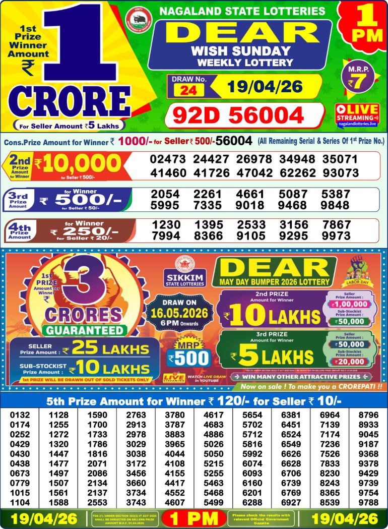 DEAR WISH SUNDAY WEEKLY LOTTERY 1PM 19/04/2026 April 19, 2026 Leave a Comment on DEAR WISH SUNDAY WEEKLY LOTTERY 1PM 19/04/2026 Posted in Results Share now: XFacebookPinterestRedditVKDiggLinkedinMix Related Results 0 1 DEAR LUCKY SATURDAY WEEKLY LOTTERY 8PM 18/04/2026 0 2 PUNJAB STATE DEAR BAISAKHI BUMPER RESULT 18/04/2026 0 1 DEAR ELITE SATURDAY WEEKLY LOTTERY 6PM 18/04/2026 0 3 DEAR 50 JACKAL SATURDAY WEEKLY LOTTERY 5PM 18/04/2026