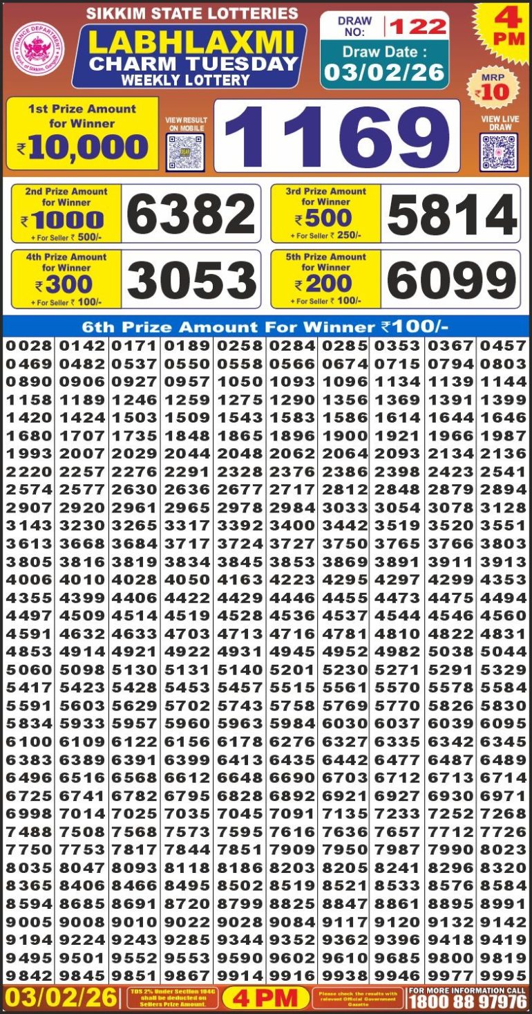 LABHLAXMI CHARM TUESDAY WEEKLY LOTTERY 4PM 03/02/2026 February 3, 2026 Leave a Comment on LABHLAXMI CHARM TUESDAY WEEKLY LOTTERY 4PM 03/02/2026 Posted in Results Share now: XFacebookPinterestRedditVKDiggLinkedinMix Related Results 0 3 Dear 50 jackal Saturday weekly lottery 5pm 28/02/2025 0 3 Labhlaxmi joy Saturday weekly lottery 4pm 27/02/2026 0 7 Dear 50 clot Friday weekly lottery 5pm 27/10/2025 0 8 Labhlaxmi glow friday weekly lottery 4pm 27/02/2026