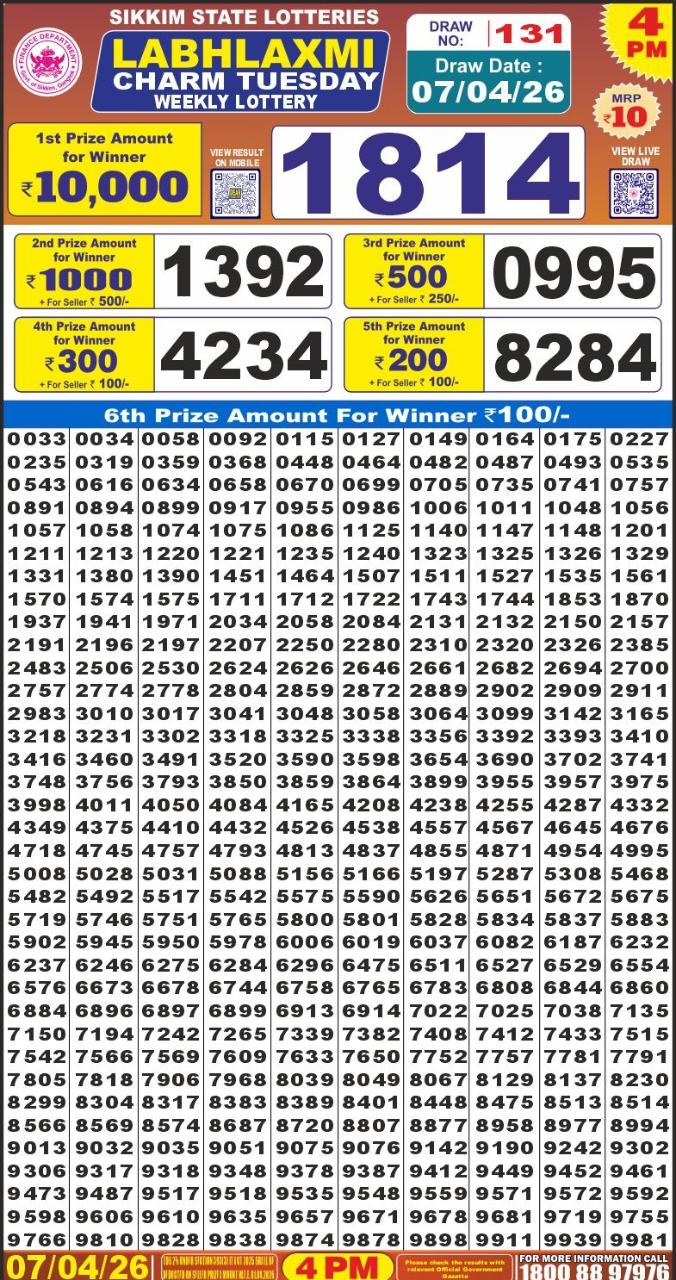 Labhlaxmi charm tuesday weekly lottery 4pm 07/04/2026 April 7, 2026 Leave a Comment on Labhlaxmi charm tuesday weekly lottery 4pm 07/04/2026 Posted in Results Share now: XFacebookPinterestRedditVKDiggLinkedinMix Related Results 0 1 Dear dream Wednesday weekly lottery 8pm 01/04/2026 0 1 Dear regal Wednesday weekly lottery 6pm 01/04/2026 0 1 Dear 50 buster Wednesday weekly lottery 5pm 01/04/2026 0 1 Dear 50 buster Wednesday weekly lottery 5pm 01/04/2026