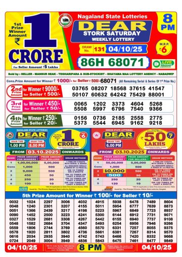 Dear 50 jackel Saturday weekly lottery 6pm 04/10/2025