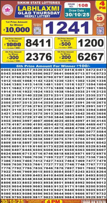 Labhlaxmi glad Thursday weekly lottery 4pm 30/10/2025