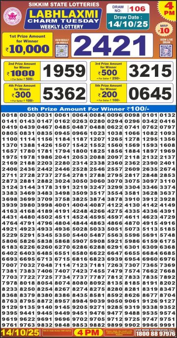 Labhlaxmi charm Tuesday weekly lottery 4pm 14/10/2025