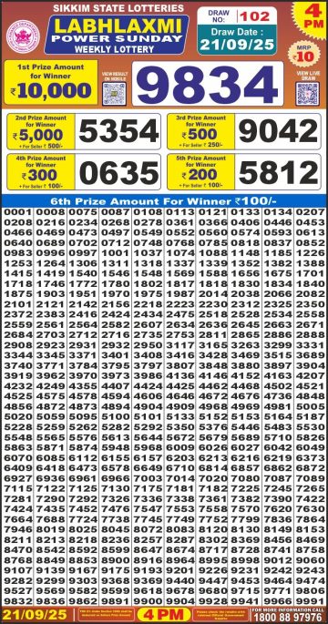 Labh Laxmi power sunday weekly lottery 4pm 21/09/2025